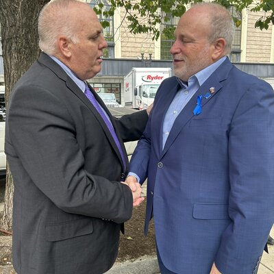 Boston City Councilor Ed Flynn (left) shaking hands with Israeli Consul General Meron Reuben