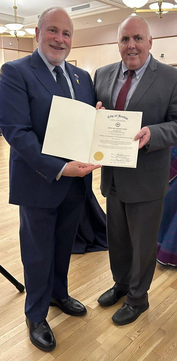 Jun 17, 2024 Israeli Consul General Meron Reuben and Boston City Councilor Ed Flynn holding a City Council resolution for Israel's 76th Independence Day