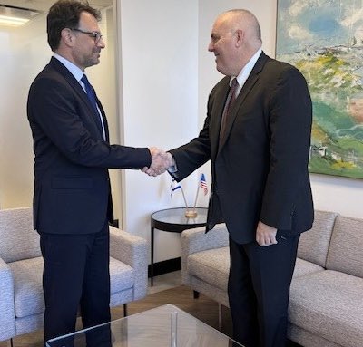Feb 5, 2026 Ed Flynn (right) shaking hands with Israeli Consul General Benjamin Sharoni (left) at the Israeli Consulate